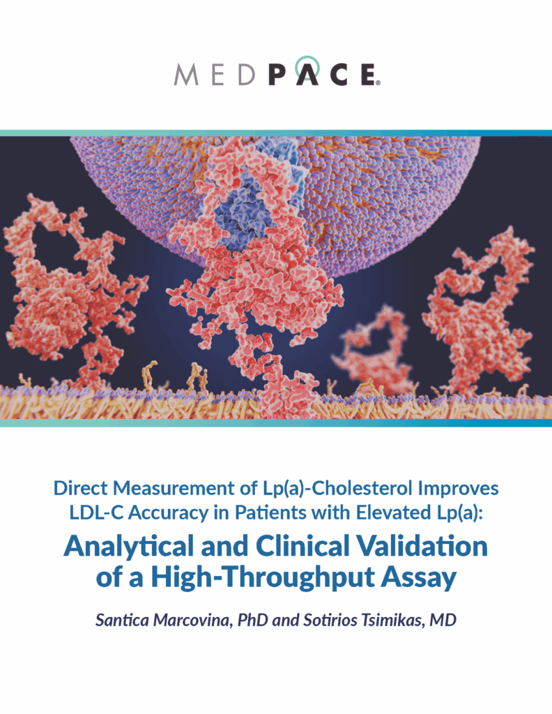 Medpace’s central laboratories offers a unique advantage for Sponsors seeking advanced lipid biomarker analysis through its exclusive research rights from Megaron, Inc. for direct Lp(a)-cholesterol measurement. This assay is derived from and validated against the original gold-standard methods developed in Dr. Sotirios Tsimikas’ laboratory, ensuring scientific rigor and reliability. As the only reference lab to offer both Lp(a)-C and corrected LDL-Ccorr testing, Medpace also provides optional panels including Lp(a), apoB, OxPL-apoB, OxPL-apo(a), and inflammatory markers for comprehensive lipid and cardiovascular risk profiling. Developed in collaboration with leading experts in Lp(a) and lipoprotein biology, including Dr. Santica Marcovina and Dr. Tsimikas, these assays are fully suited for both GCP-aligned clinical trials and observational research.
